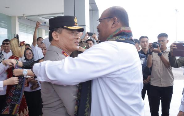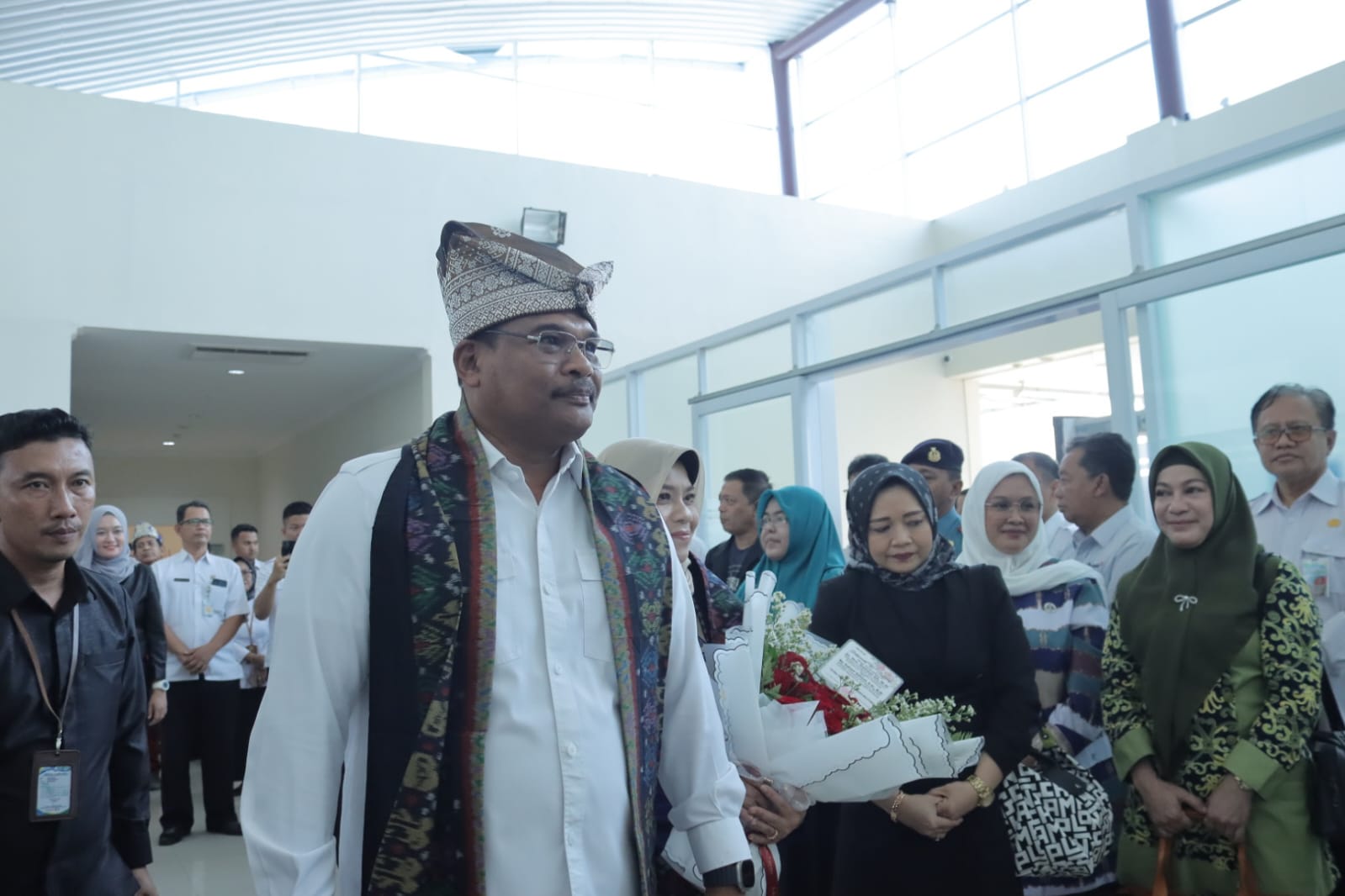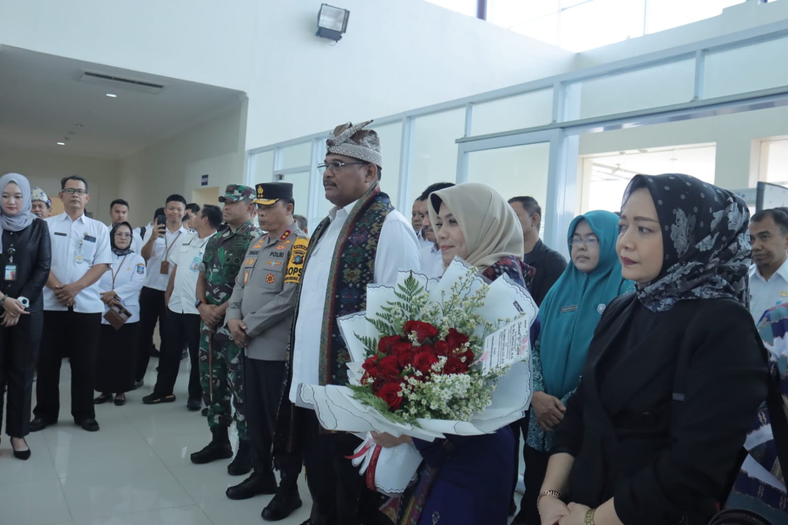 Kedatangan orang nomor wahid di Bangka Belitung ini disambut hangat Sekda Naziarto, Forkopimda, unsur Vertikal, Kepala Biro Umum Burhanuddin, dan Kepala OPD lainnya, dengan memakaikan stanjak cual khas Bangka Belitung, rangkaian bunga dan tarian selamat datang.