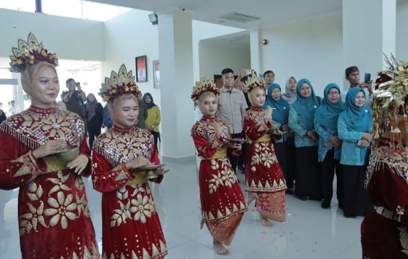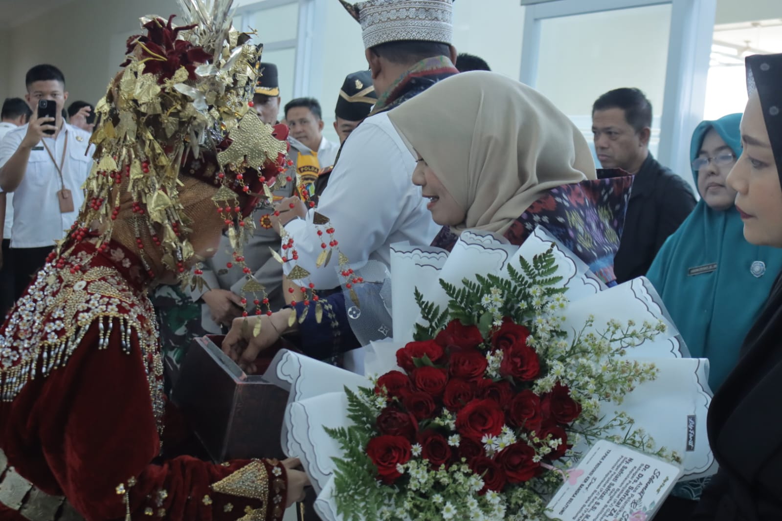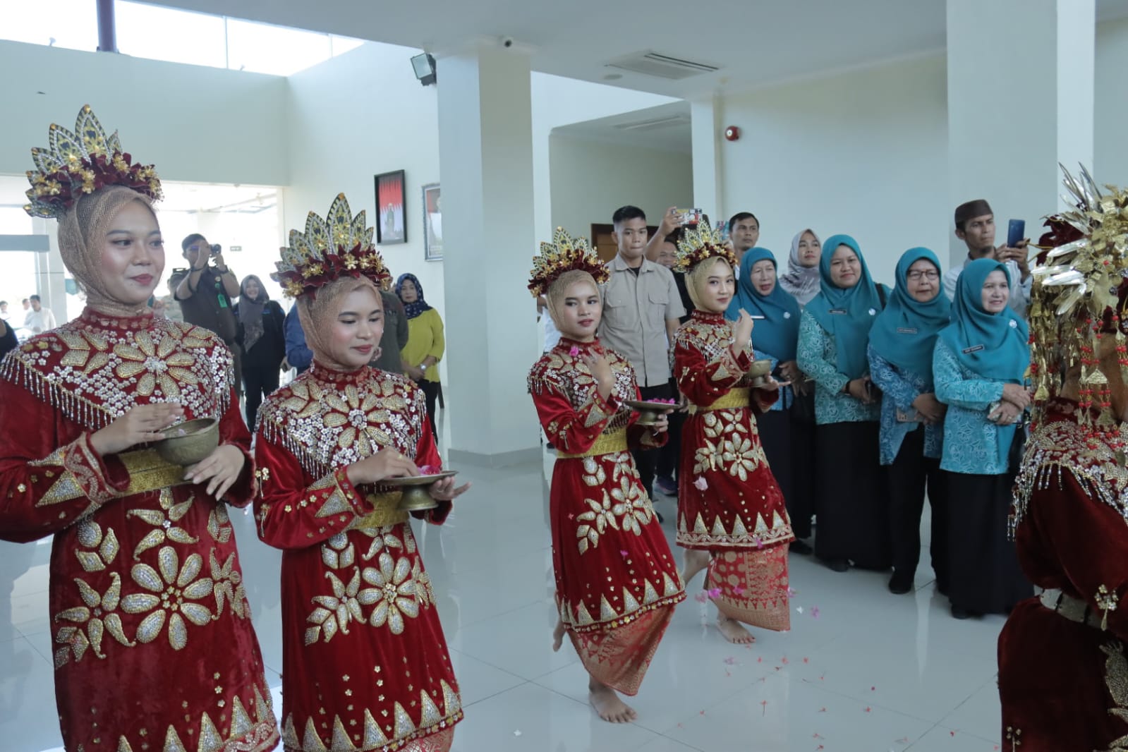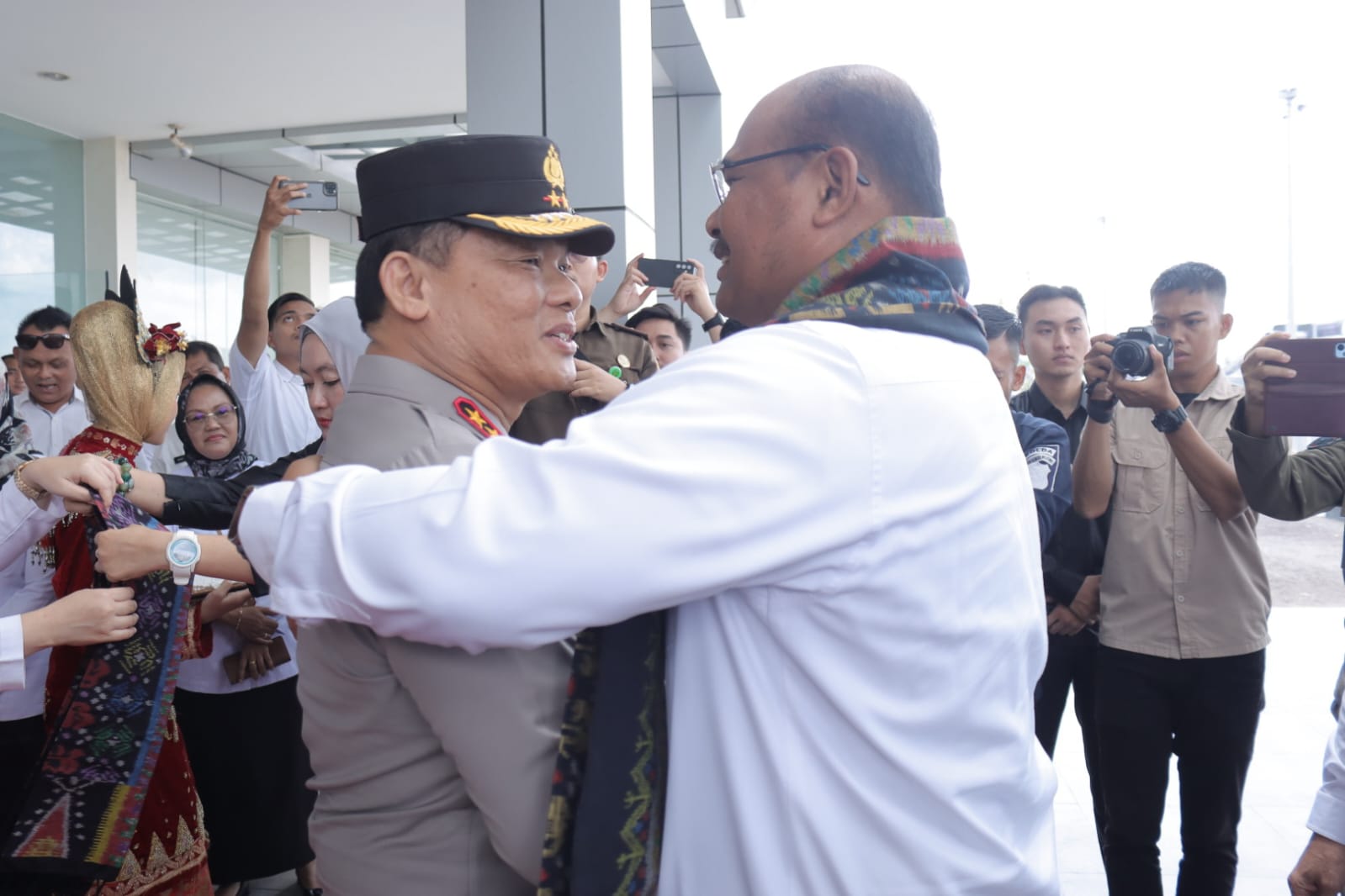 Kedatangan orang nomor wahid di Bangka Belitung ini disambut hangat Sekda Naziarto, Forkopimda, unsur Vertikal, Kepala Biro Umum Burhanuddin, dan Kepala OPD lainnya, dengan memakaikan stanjak cual khas Bangka Belitung, rangkaian bunga dan tarian selamat datang.