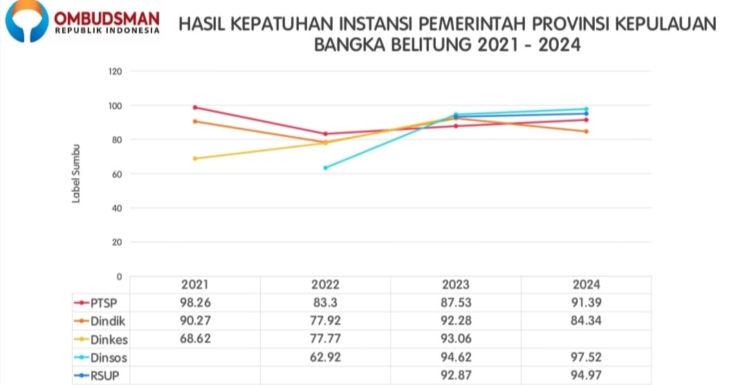 Diungkapkan Yozar, hasil kepatuhan instansi pada Pemprov. Babel Tahun 2024 posisi nilai tertinggi dicapai Dinsos PMD diikuti RSUP, DPMPTSP dan Dinas Pendidikan.
