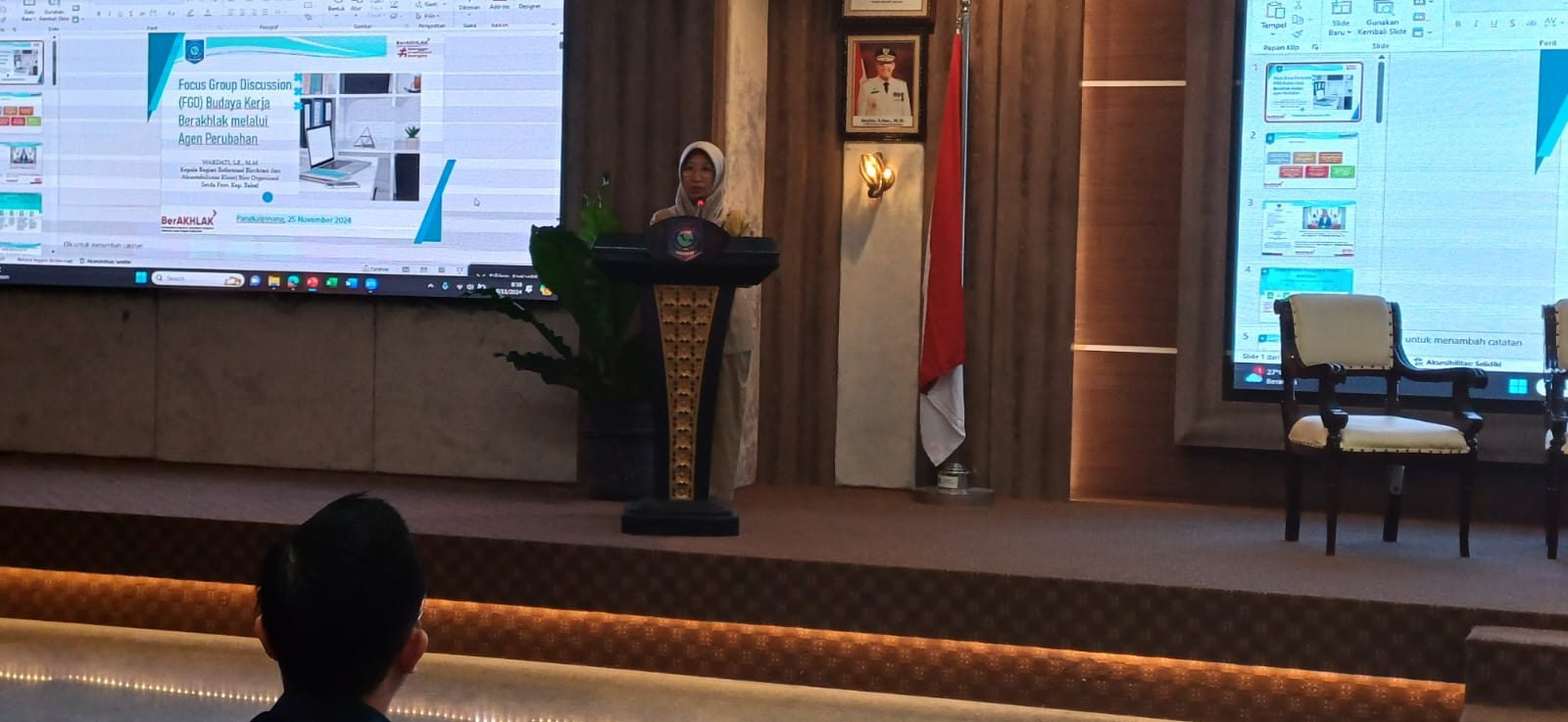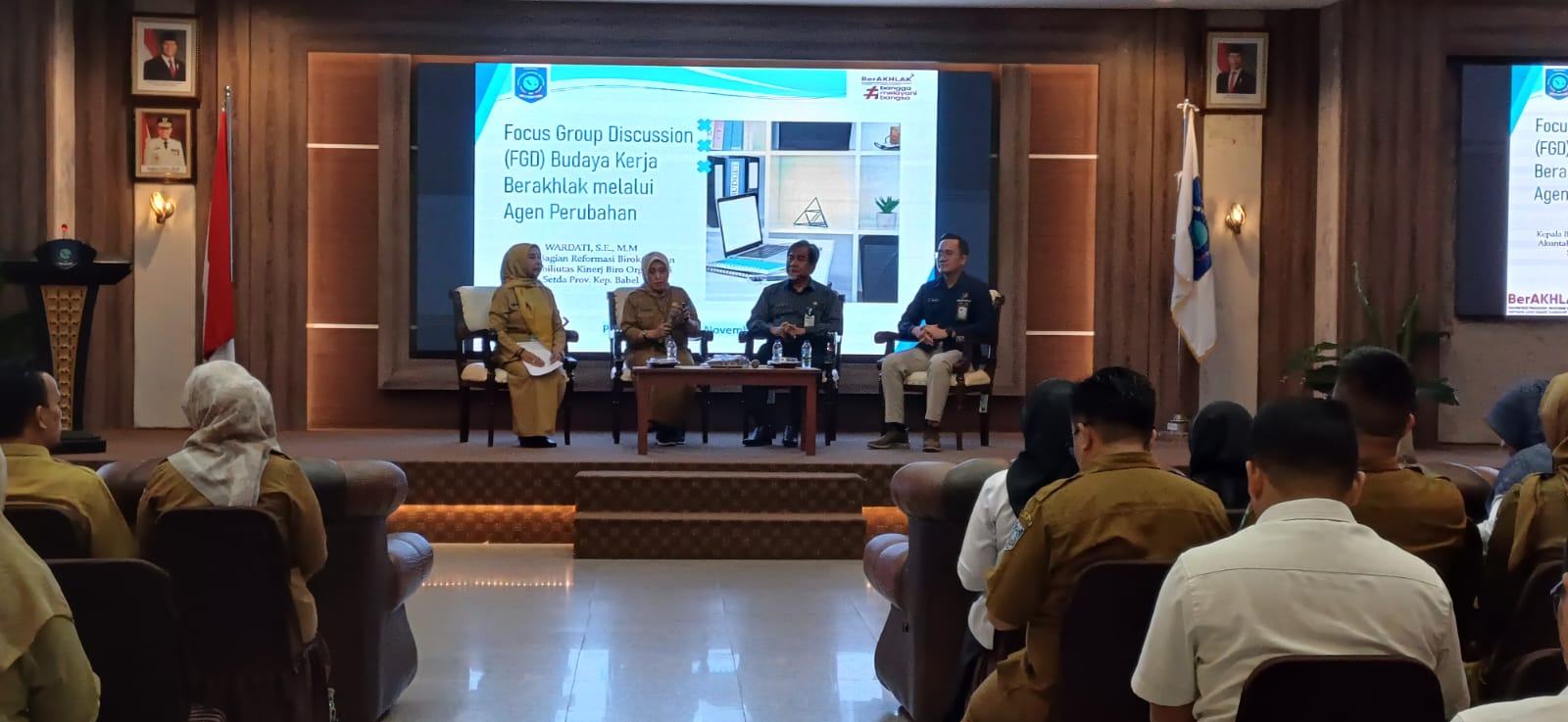 Upaya tersebut salah satunya dilakukan lewat Focus Group Discussion (FGD) yang diselenggarakan Biro Organisasi Setda Kep. Babel dengan tema 'Internalisasi Budaya Kerja BerAKHLAK melalui Agen Perubahan', Senin (25/11/2024) bertempat di Ruang Rapat Pasir Padi Kantor Gubernur Babel.