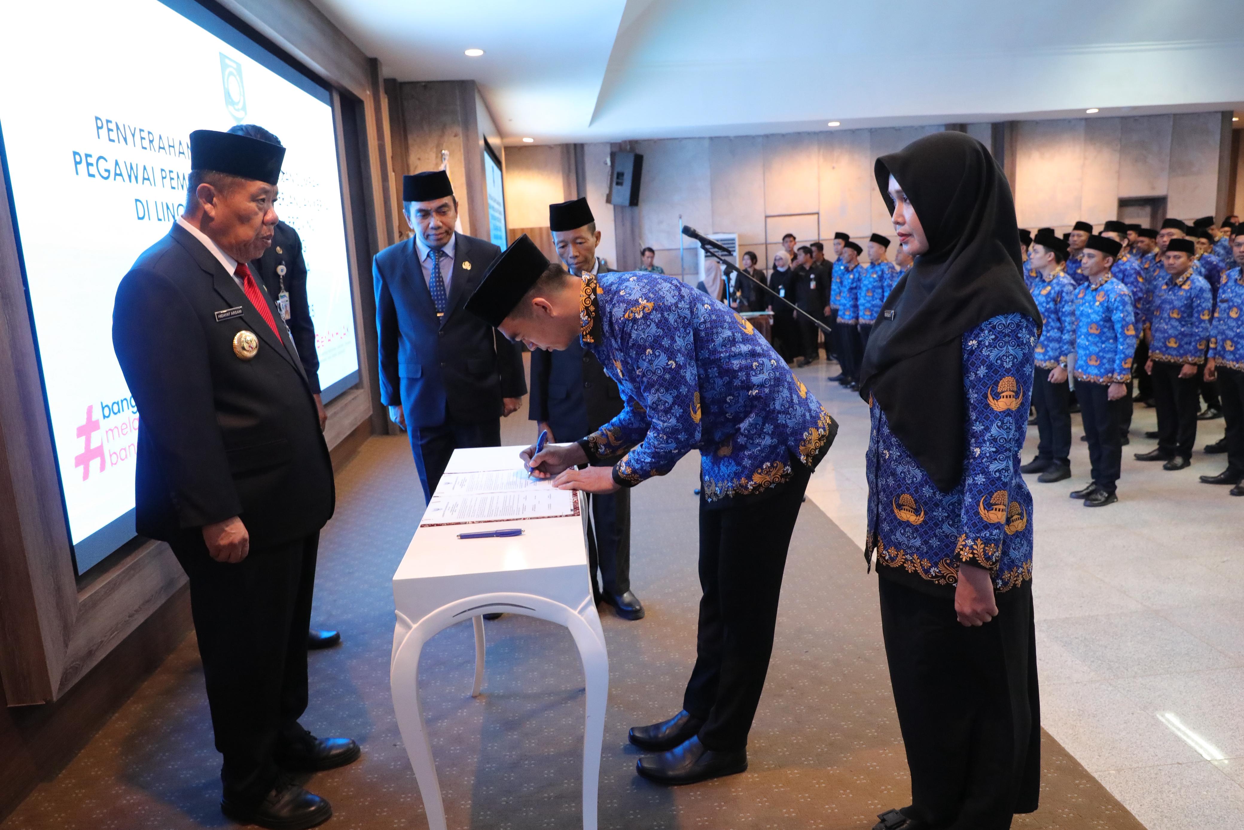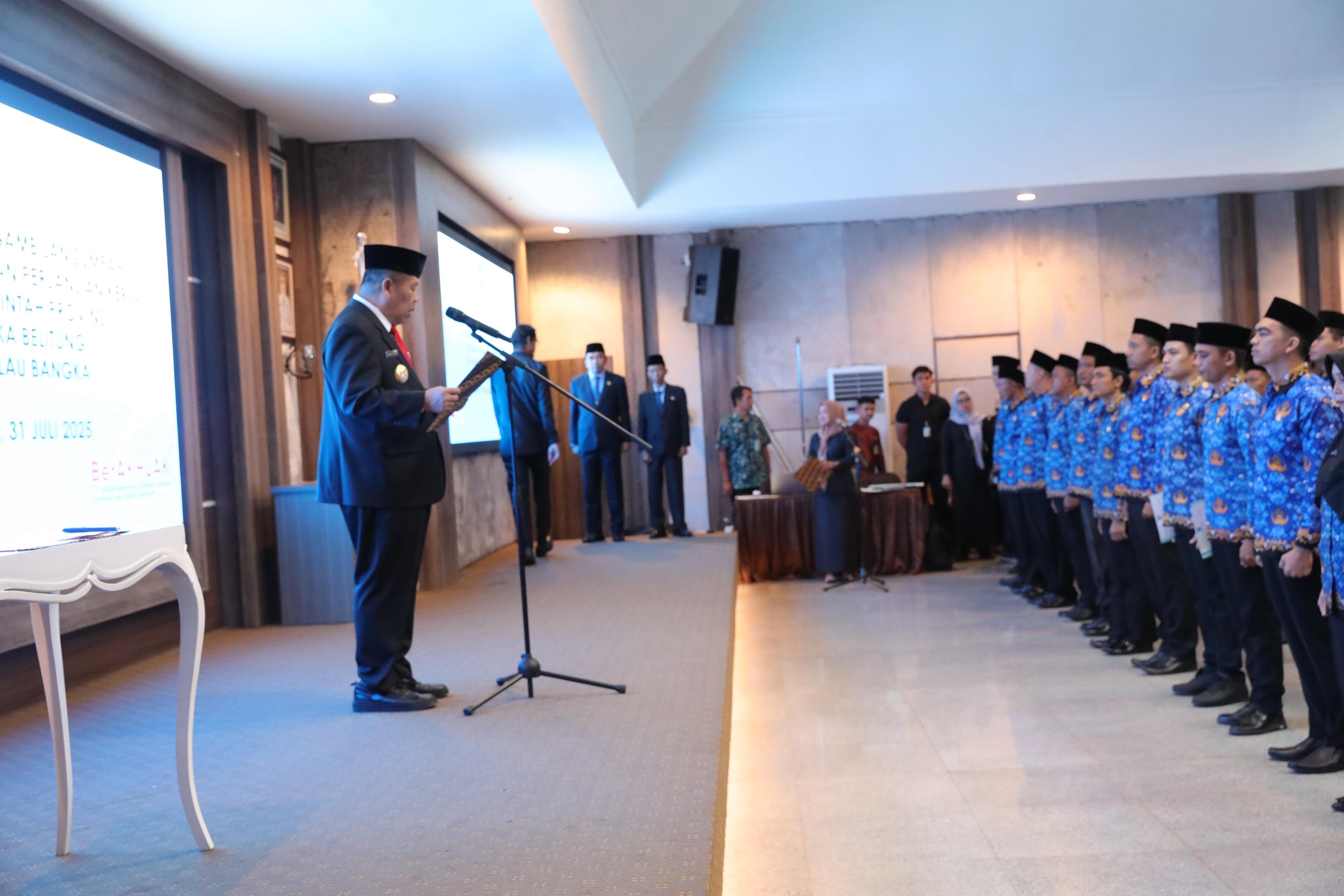 PANGKALPINANG - Gubernur Kepulauan Bangka Belitung (Kep. Babel) Hidayat Arsani resmi mengangkat dan melantik 394 Pegawai Pemerintah dengan Perjanjian Kerja (PPPK), Tenaga Kesehatan dan Guru Formasi tahun 2024 di Ruang Pasir Padi Kantor Gubernur Air Itam Pangkalpinang, Kamis (31/7/25).