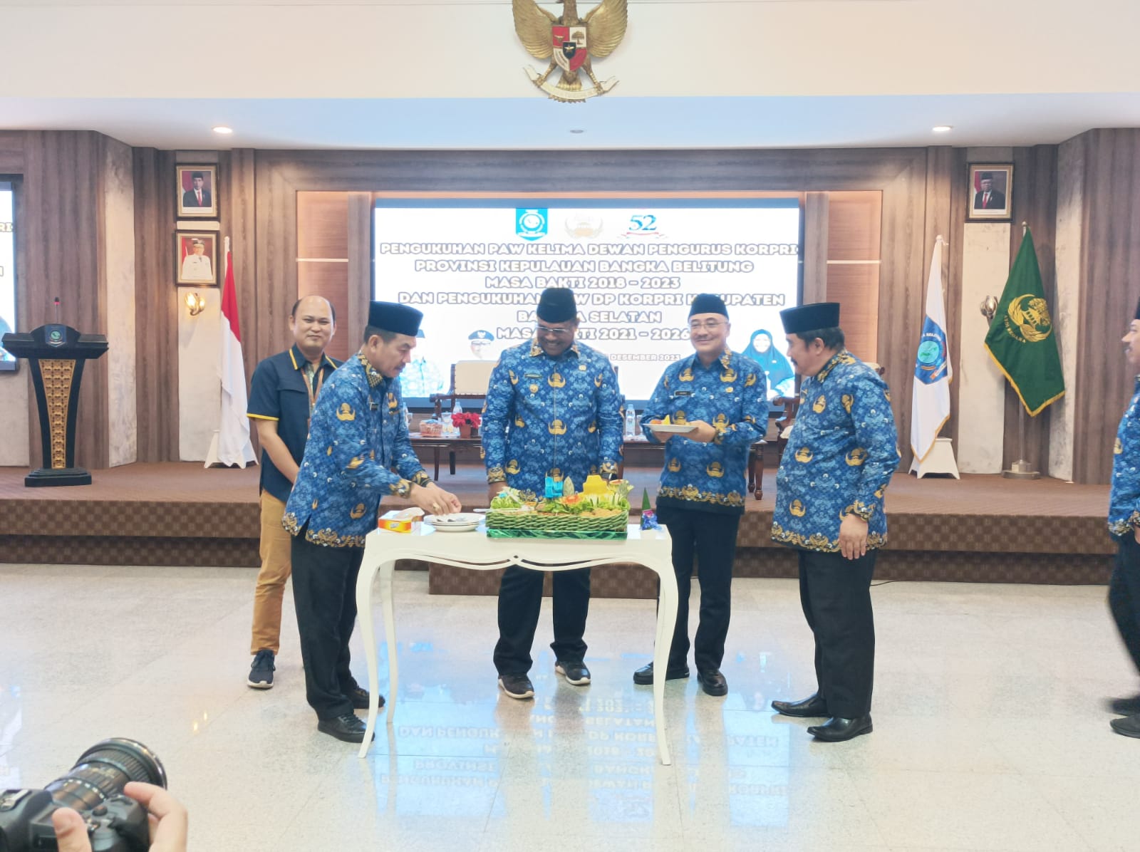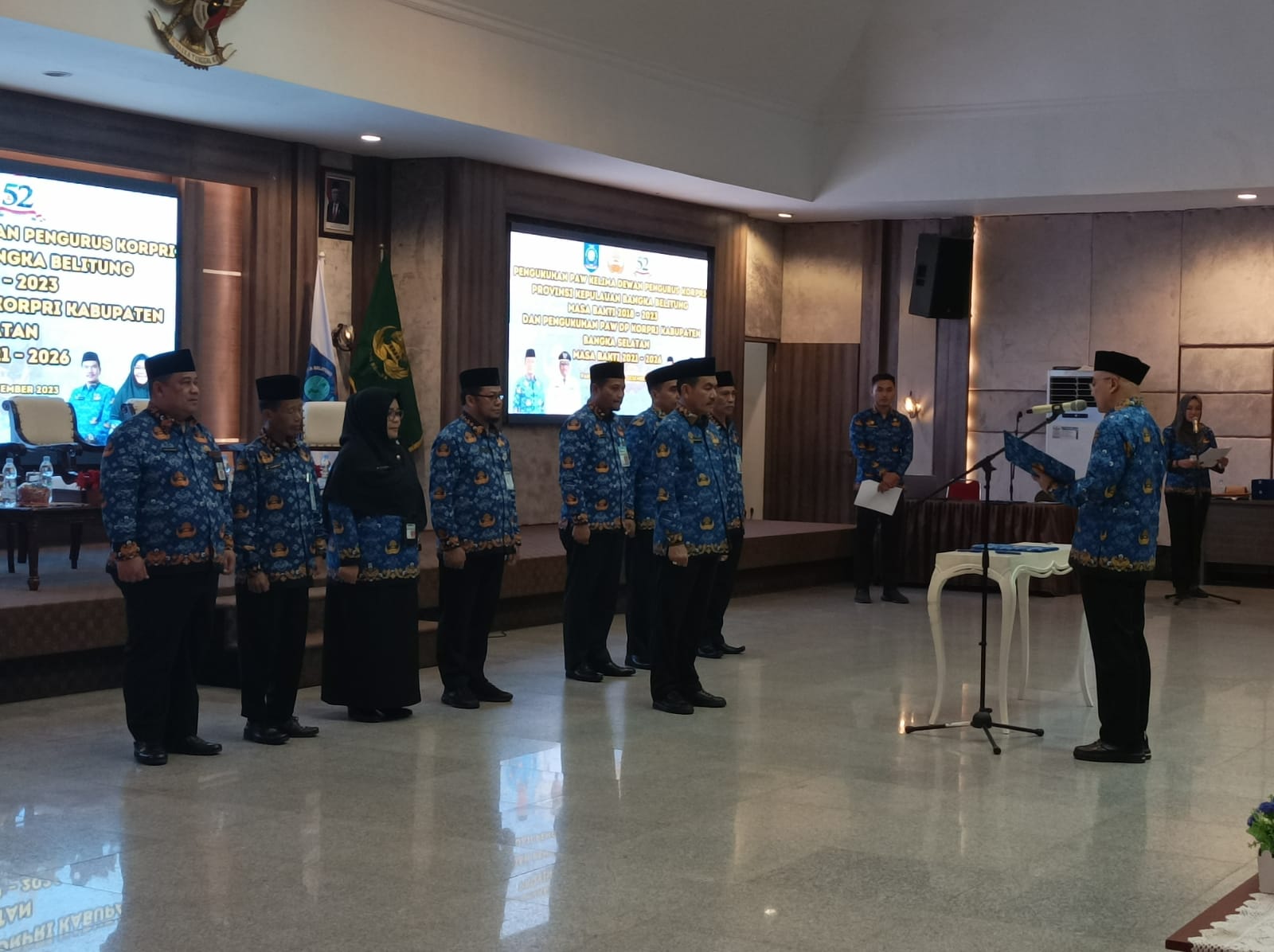 PANGKALPINANG - Plt. Asisten Perekonomian dan Pembangunan Ahmad Yani, menghadiri Pengukuhan Pengganti Antar Waktu (PAW) Kelima Dewan Pengurus Korps Pegawai Republik Indonesia (KORPRI) Masa Bakti 2018-2023, Pengukuhan PAW Dewan Pengurus Korpri Kabupaten Bangka Selatan Masa Bakti 2021-2026, serta Sosialisasi Penguatan Organisasi KORPRI Prov. Kep. Babel Tahun 2023 di Ruang Pasir Padi Kantor Gubernur, Senin (18/12/23).
