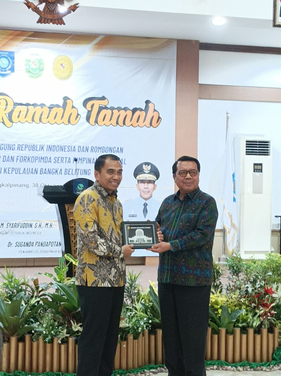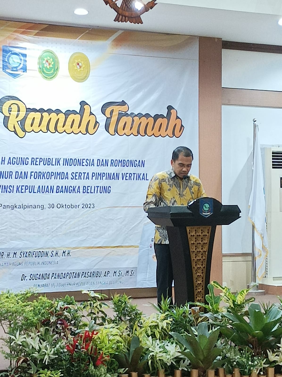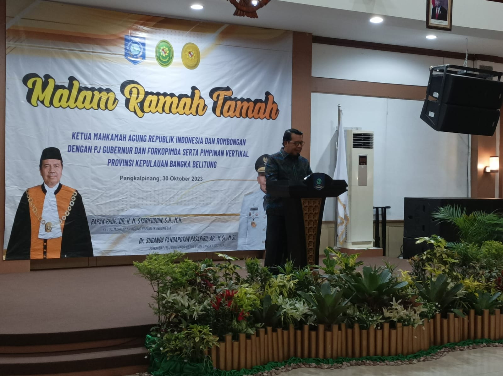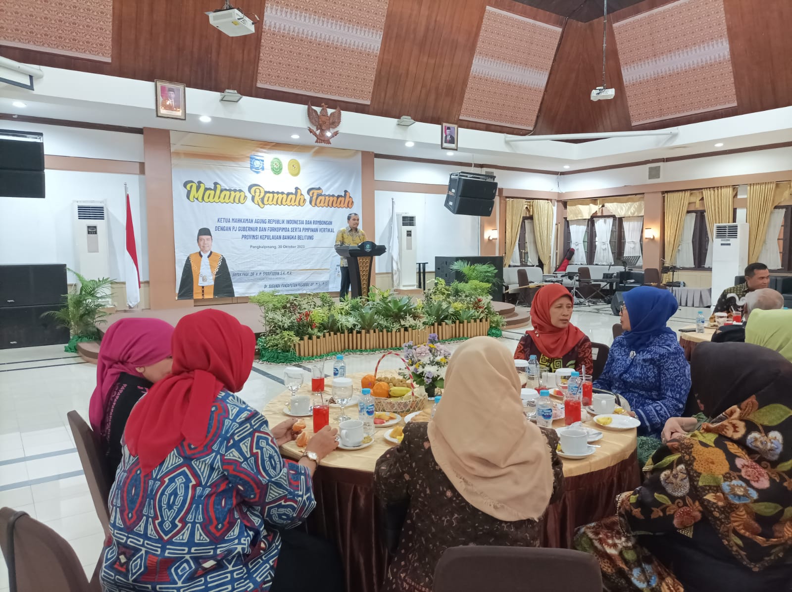 PANGKALPINANG - Tiba di bumi Serumpun Sebalai, Ketua Mahkamah Agung (MA) M. Syarifuddin beserta rombongan, diundang Penjabat (Pj) Gubernur Kepulauan Bangka Belitung (Kep. Babel) Suganda Pandapotan Pasaribu, melalui Asisten Administrasi Umum Yunan Helmi, untuk hadir dalam malam ramah tamah bersama Forkopimda dan pimpinan instansi vertikal Provinsi Kep. Babel, di Gedung Mahligai Rumah Dinas Gubernur, Senin malam (30/10/23)