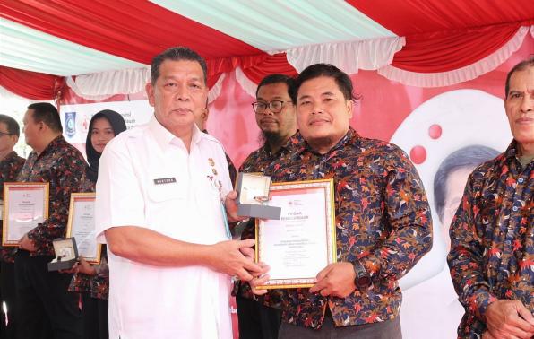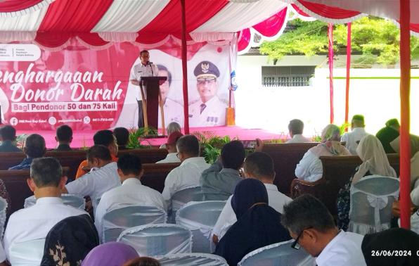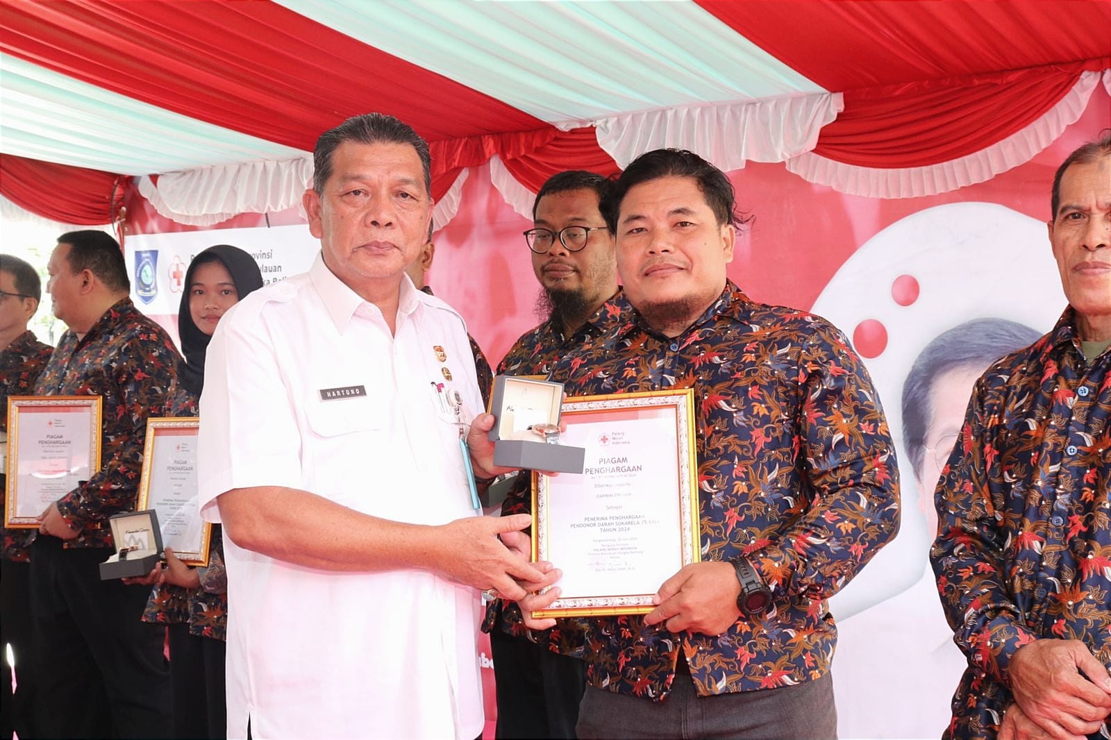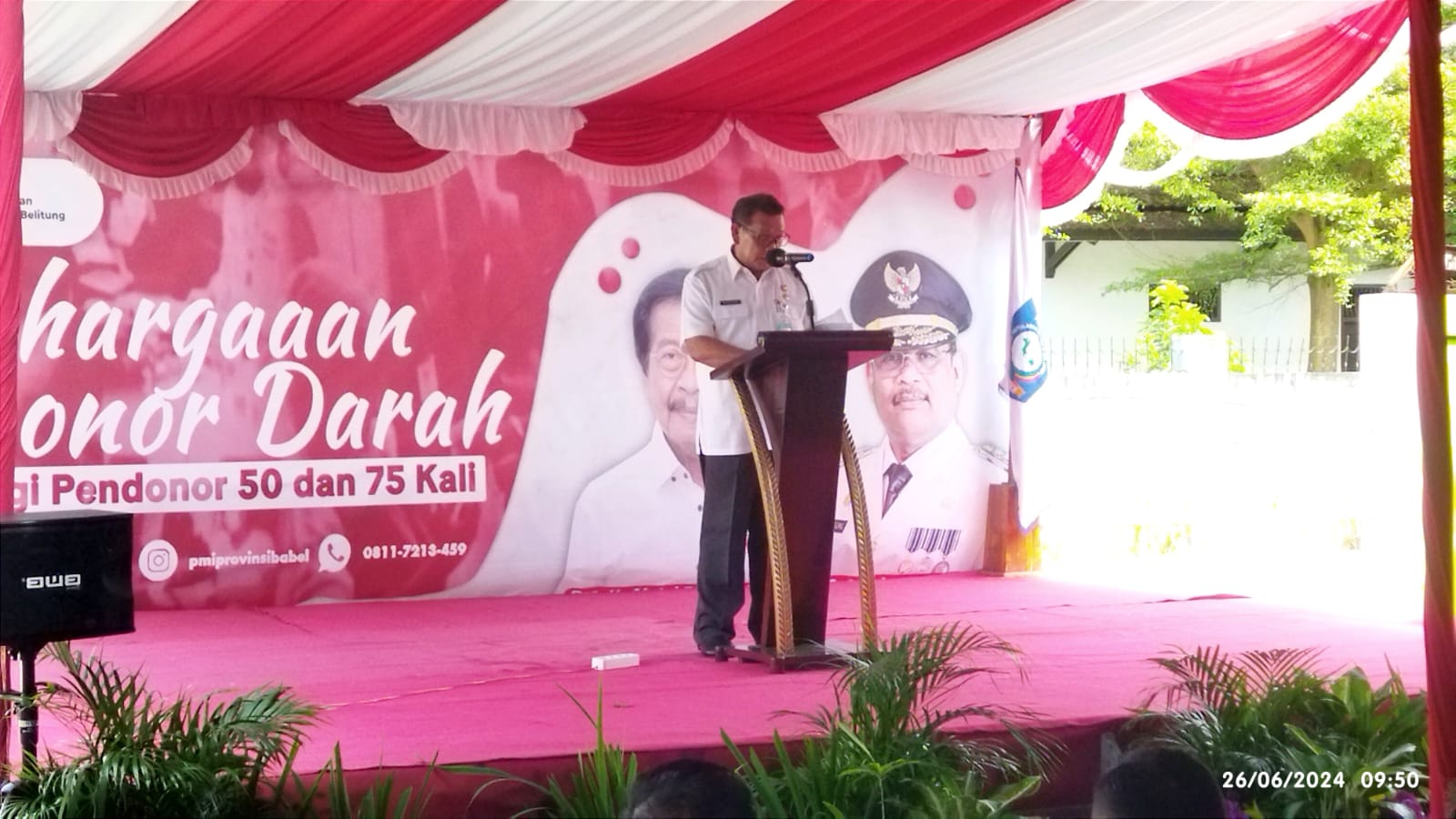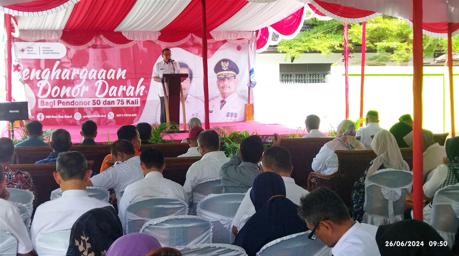 PANGKALPINANG - Penjabat (Pj) Gubernur Kepulauan Bangka Belitung (Kep. Babel) diwakili Pelaksana Tugas (Plt) Asisten Perekonomian dan Pembangunan Sekretariat Daerah (Setda) Hartono, menyerahkan penghargaan kepada pendonor darah sukarela (DDS) yang telah lebih dari 50 dan 75 kali melakukan donor darah untuk kemanusiaan.
