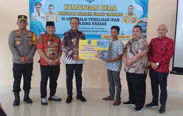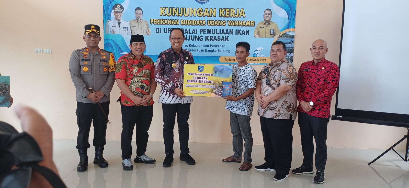 BANGKA SELATAN - Kepala Biro (Karo) Umum Setda Provinsi Kepulauan Bangka Belitung (Prov. Kep. Babel) Burhanuddin, mendampingi Penjabat (Pj) Gubernur Kep. Babel Sugito, saat melakukan kunjungan Kerja dalam rangka Perikanan Budidaya Udang Vaname Tahun 2024 di UPTD Balai Pemuliaan Ikan Tanjung Kerasak, Sadai, Kabupaten Bangka Selatan, Rabu (2/10/24).