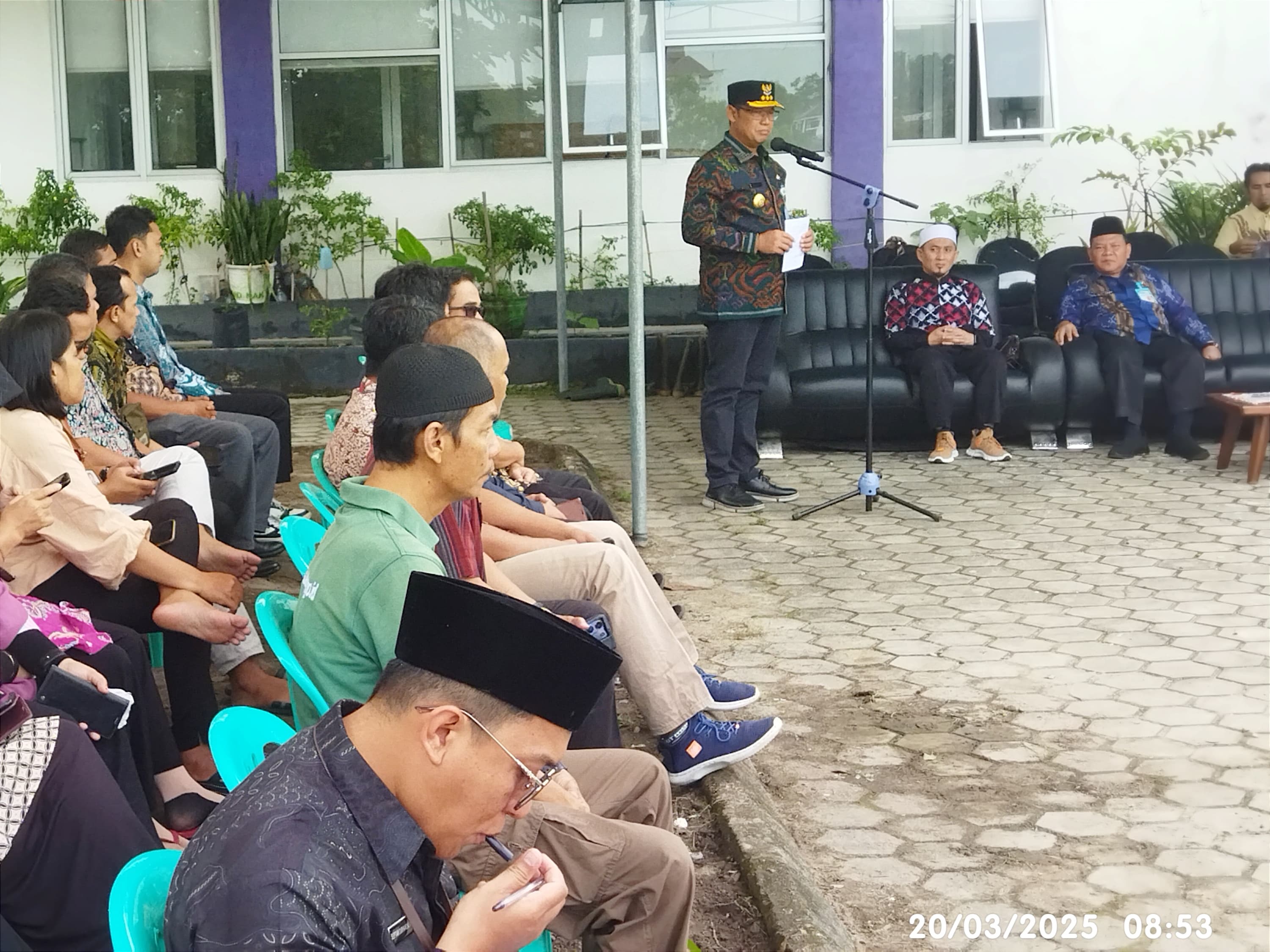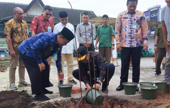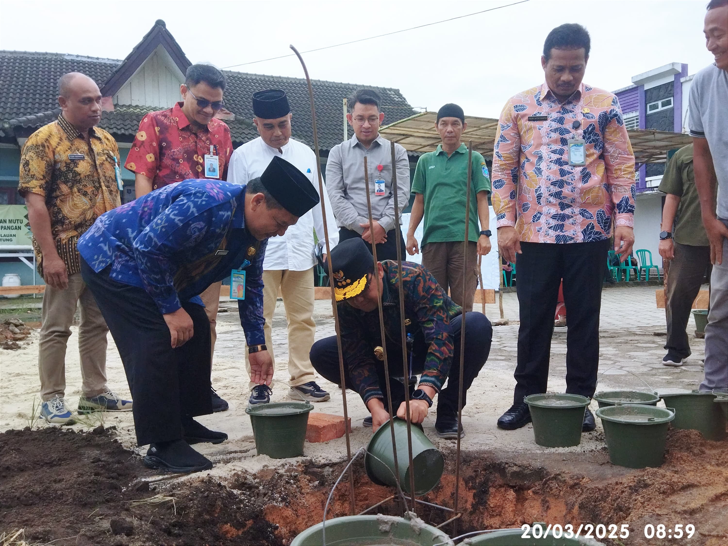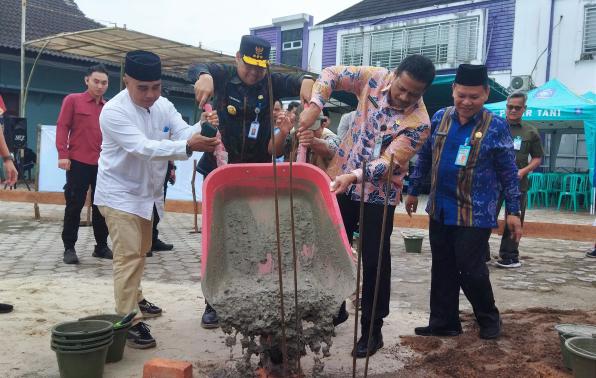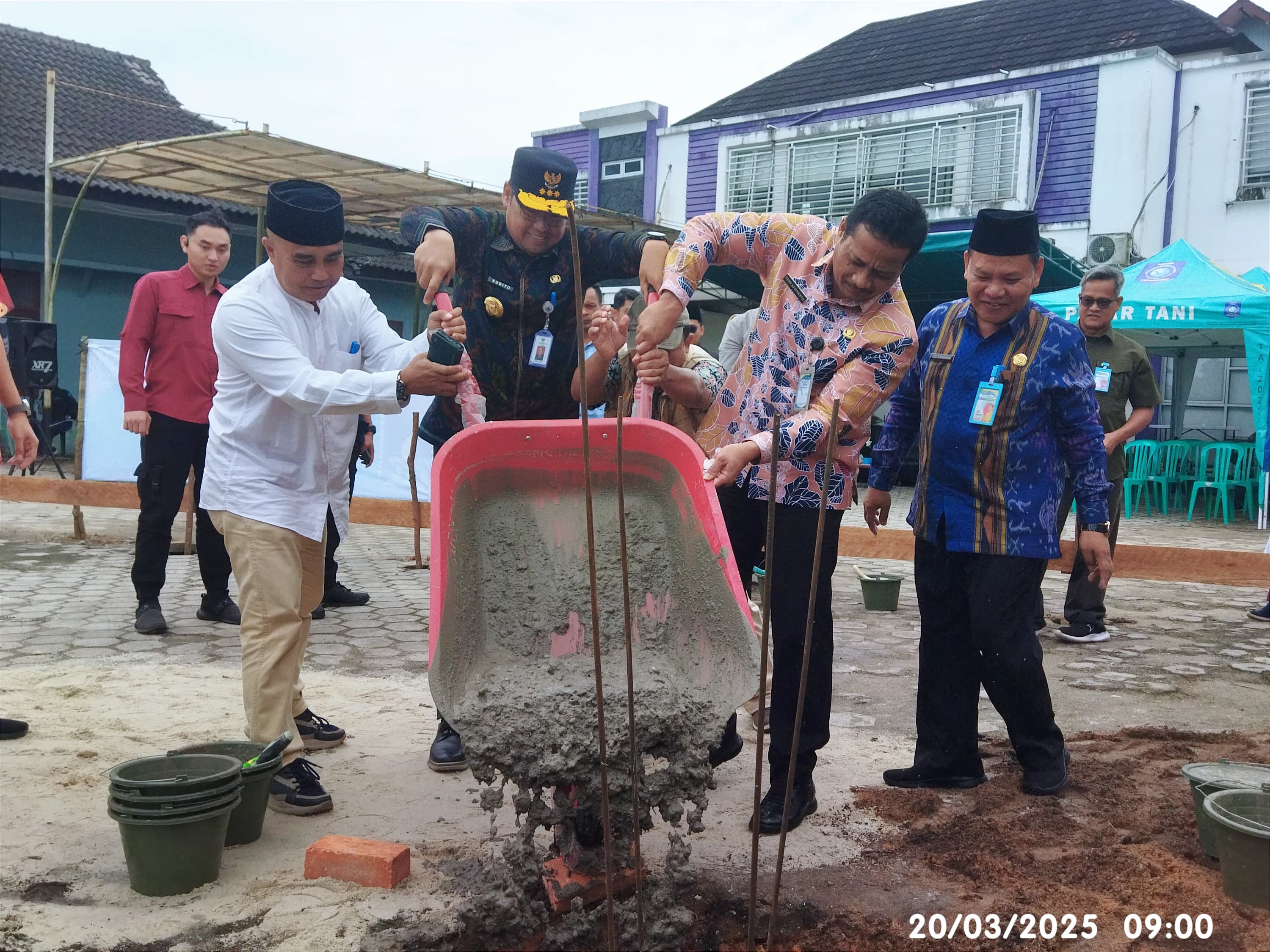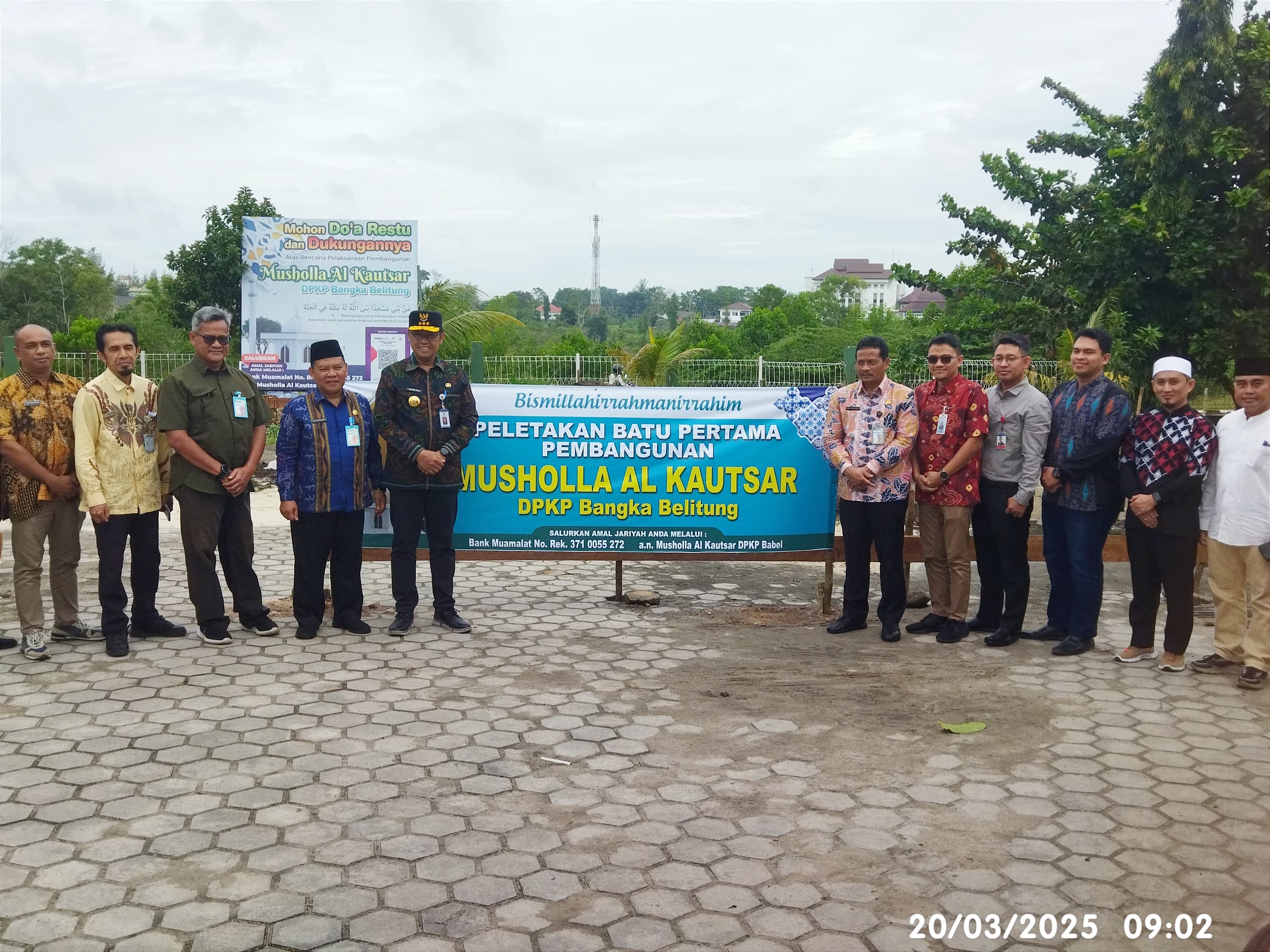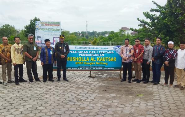 PANGKALPINANG - Penjabat (Pj) Gubernur Kepulauan Bangka Belitung (Kep. Babel) Sugito didampingi Pj. Sekretaris Daerah Babel Fery Afriyanto dan Kepala Dinas Pertanian dan Ketahanan Pangan (DPKP) Babel Edi Romdhoni secara simbolis meletakkan batu pertama pembangunan Mushola Al Kautsar yang berlokasi di halaman Kantor DPKP Provinsi Kep. Babel di Air Itam Pangkalpinang, Kamis (20/3/2025).
