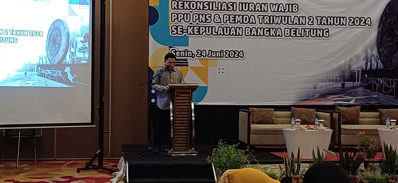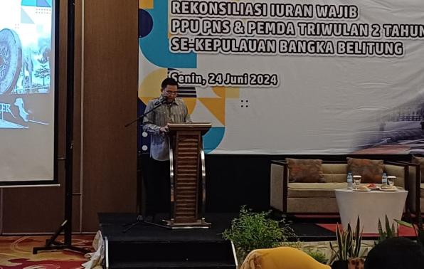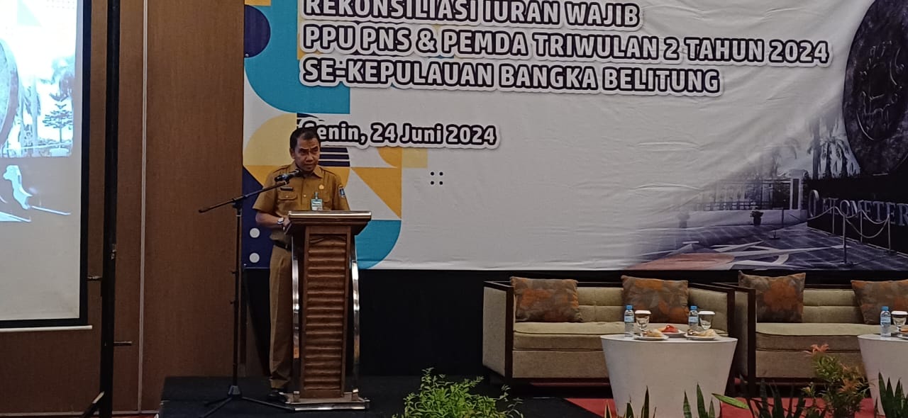 PANGKALAN BARU - Asisten Administrasi Umum Yunan Helmi, meresmikan sekaligus menjadi narasumber Pembukaan Rekonsiliasi Iuran Wajib Jaminan Kesehatan Nasional (JKN-KIS) Pemerintah Daerah Se-Provinsi Kepulauan Bangka Belitung (Prov. Kep. Babel) Triwulan II Tahun 2024, di Soll Marina Hotel & Conference Center Bangka, Kecamatan Pangkalan Baru, Kabupaten Bangka Tengah, Senin (24/6/24).